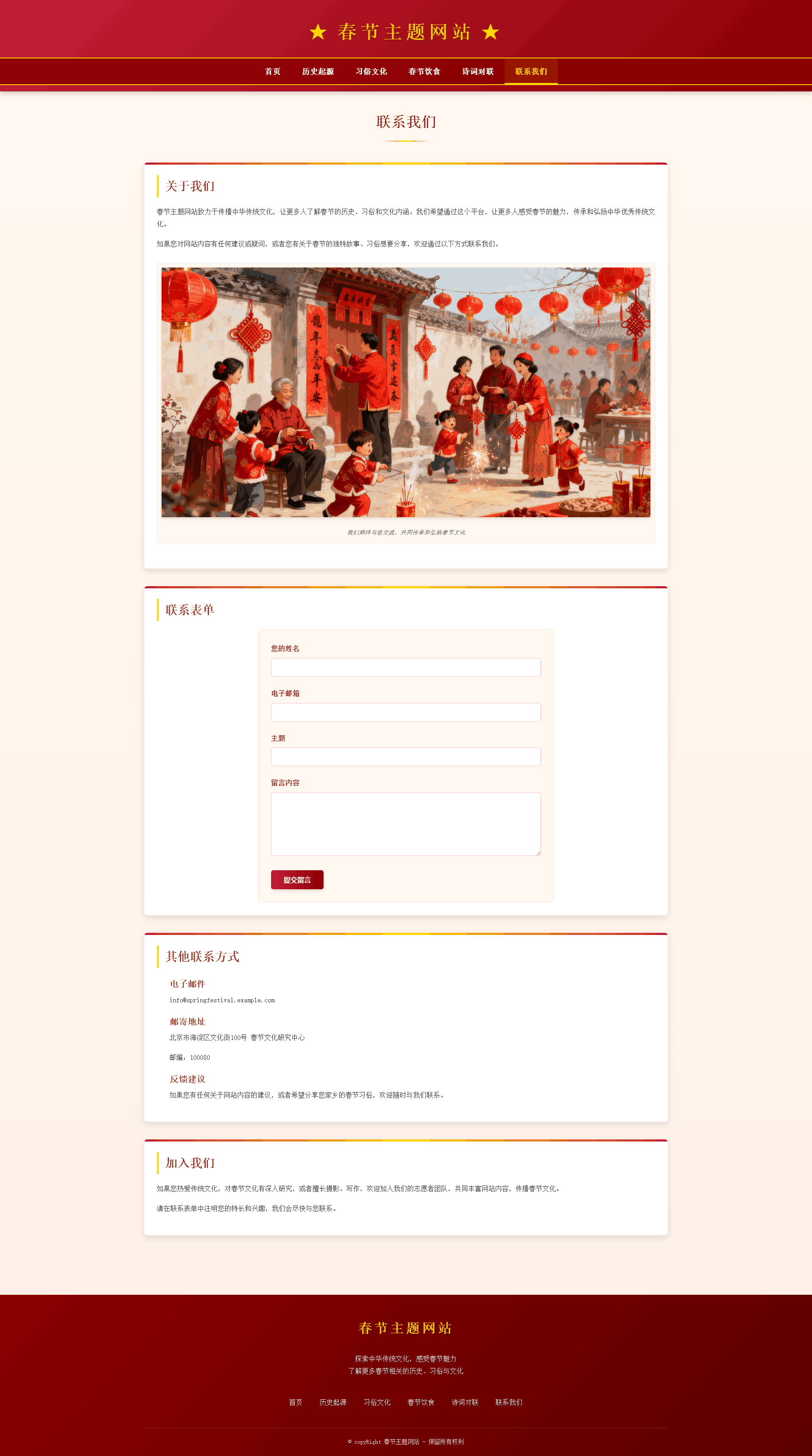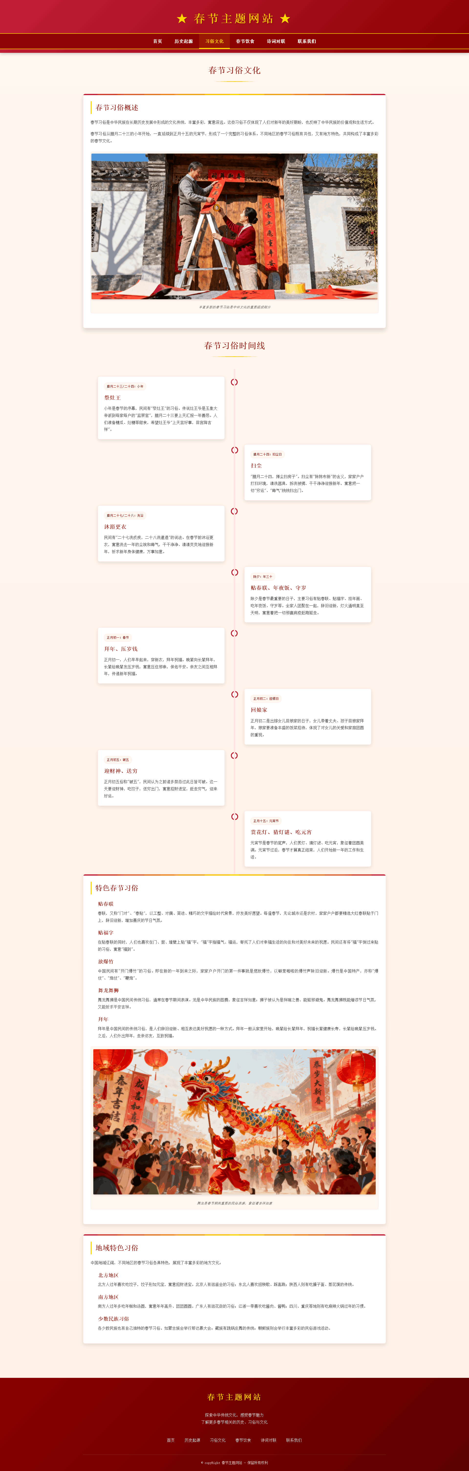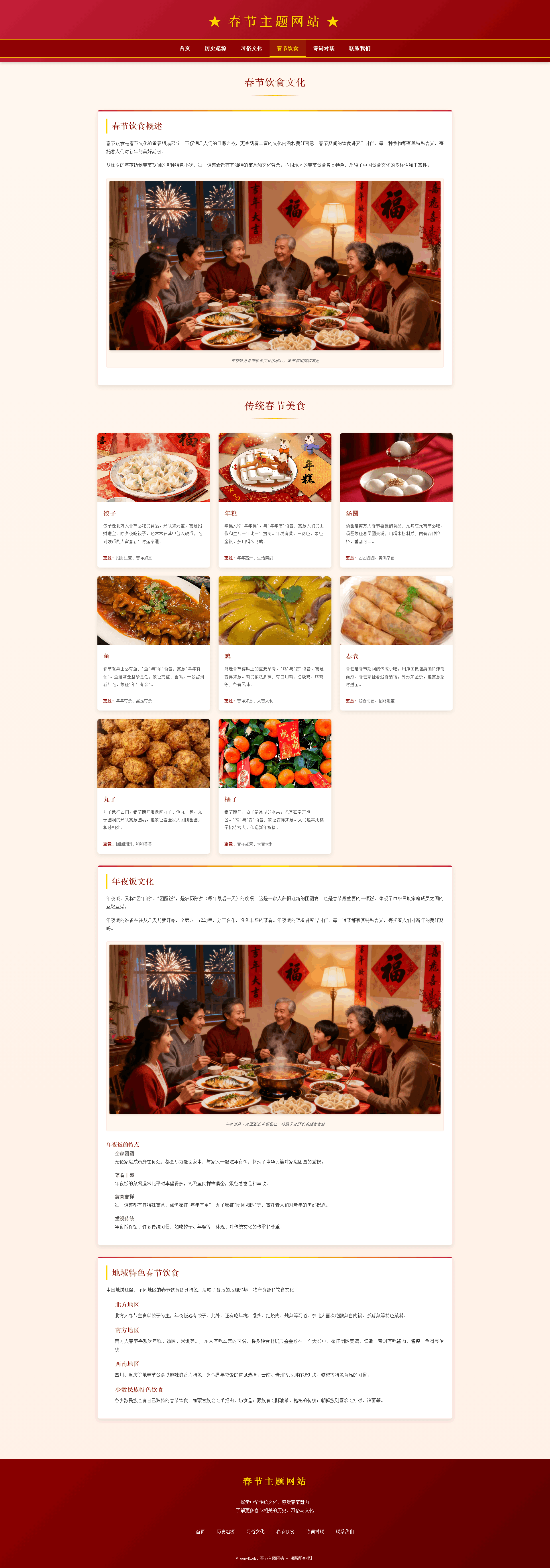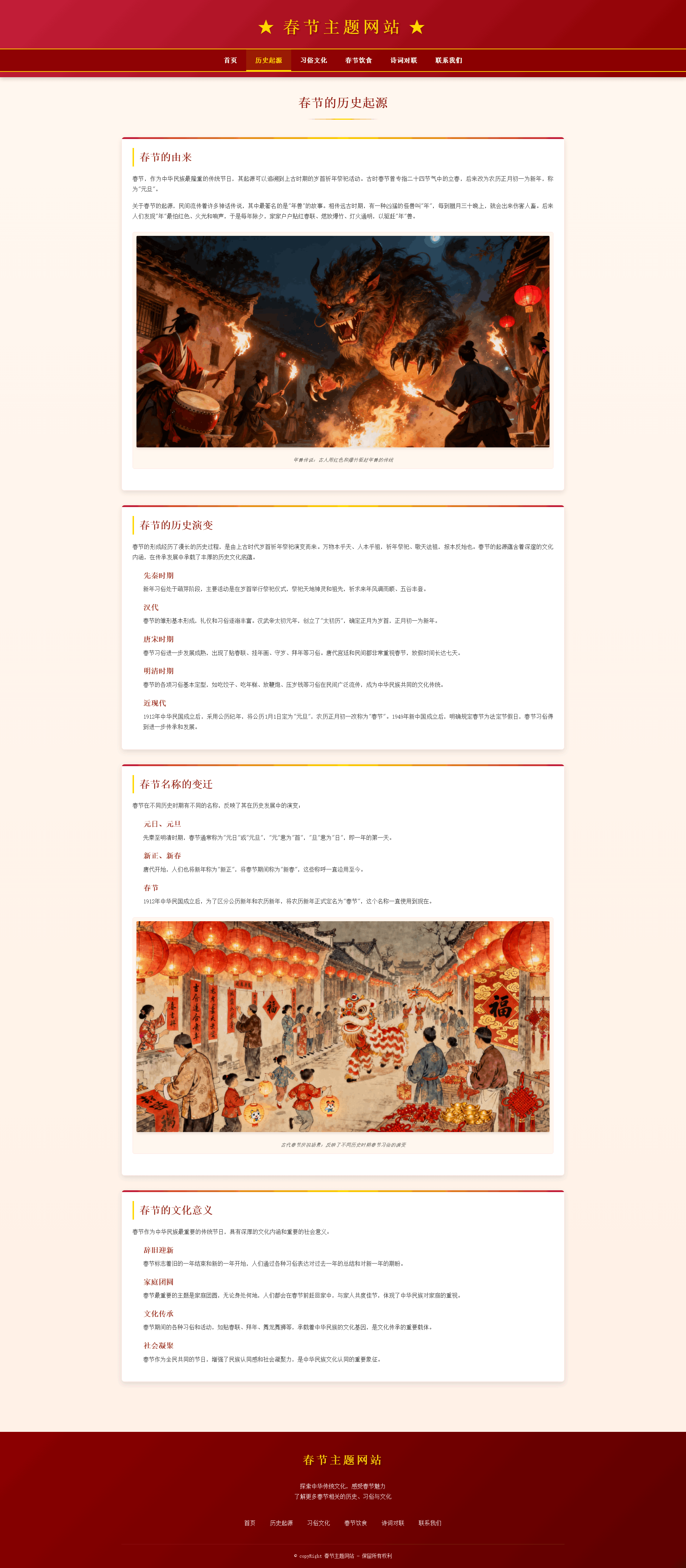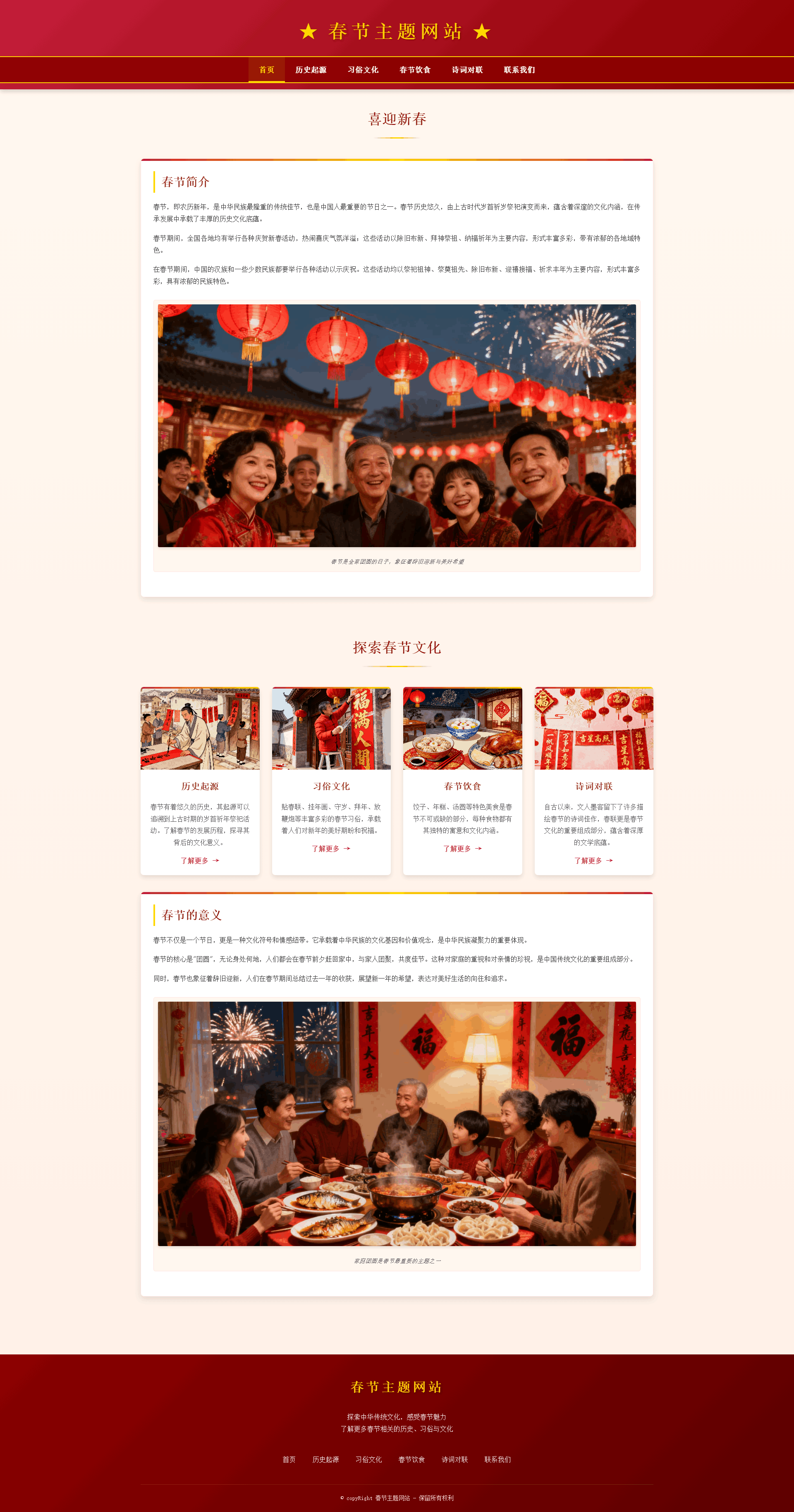 首页、历史起源、春节饮食、习俗文化、诗词对联、联系我们