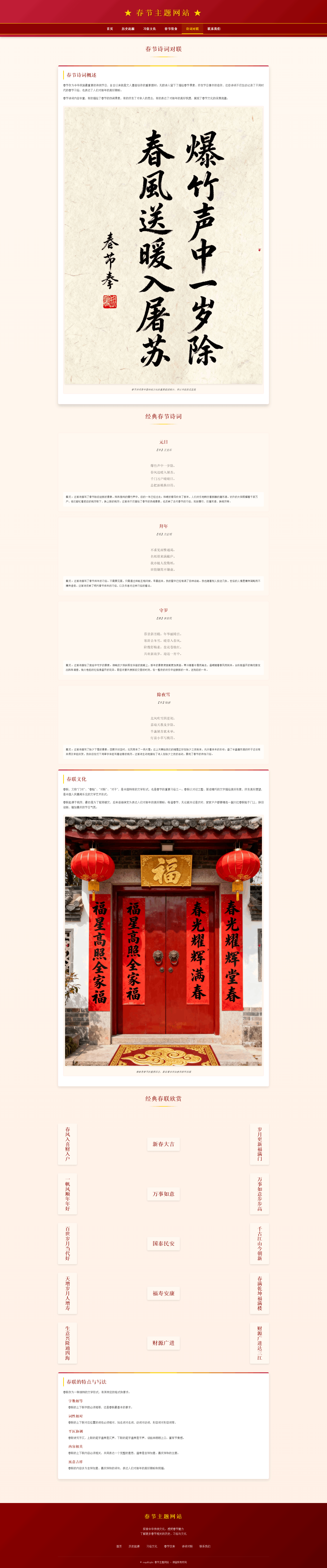 首页、历史起源、春节饮食、习俗文化、诗词对联、联系我们